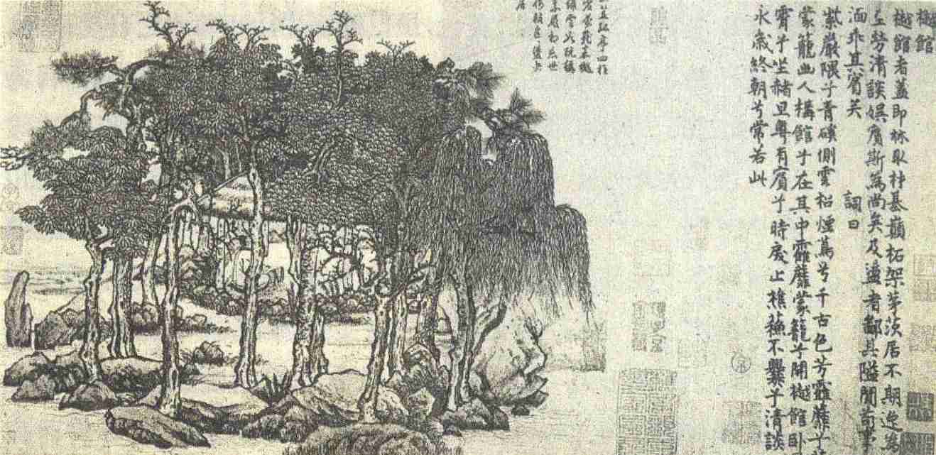 首先关于树法:仅写小丛林,不画主树。每一丛自俱远近,而远者更有一部分隐现于近者之后。如此结构,比后来的宾主法之先作主树,再补小树以成片段,要费力得多。而尤为难画的是,每一图不止丛树,常有三三两两,虽各有位置,而其意若断若连,可以想见当时的草堂饶有林木之胜,主人是一片接着一片去欣赏的。不仅如此,数丛之中,仍分宾主、远近,说明了画家已有层次感,但却与西方透视不相关,若以西画之理强加于中画,反觉可笑。
