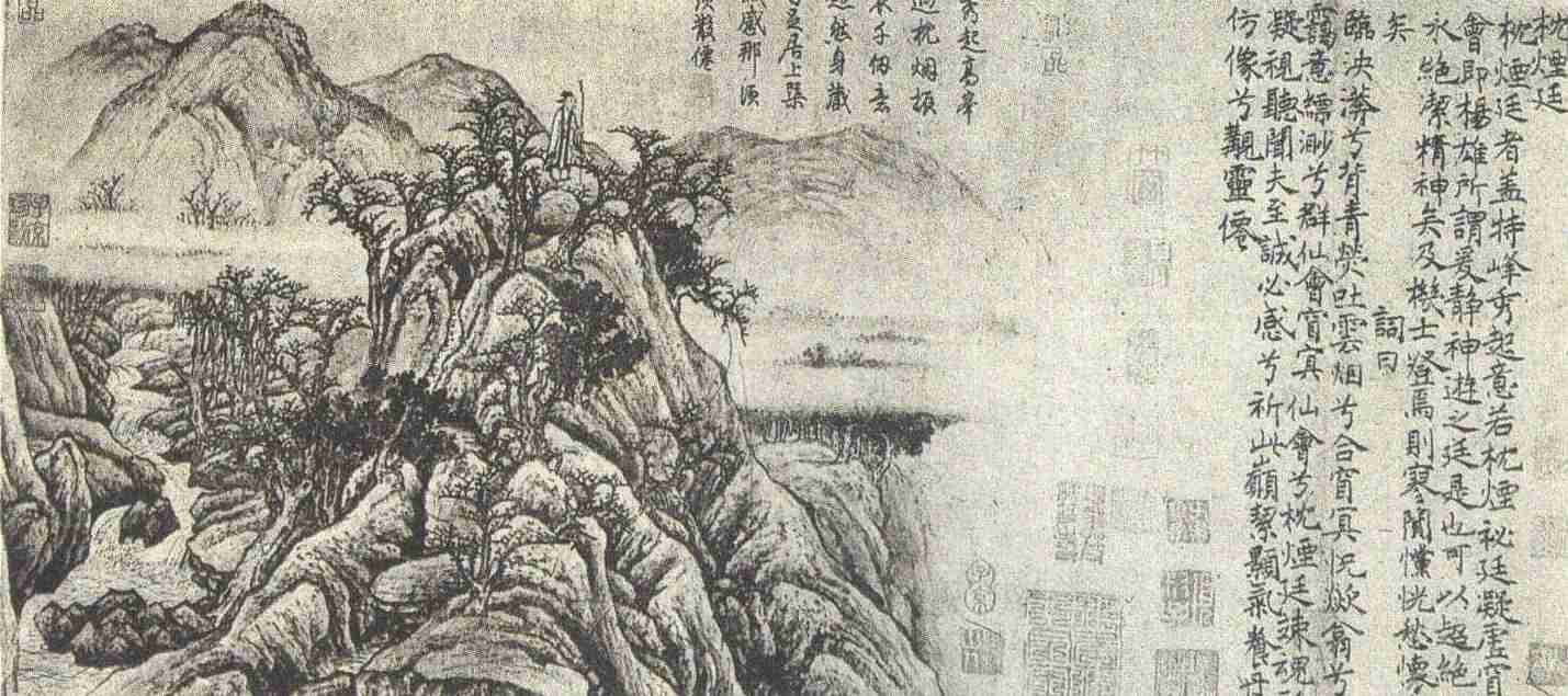 其三,上述丛林,均用夹叶,远山背后小树数层,则用点叶,无根枝,愈远墨色愈淡,得司空图所谓“返虚入浑”之妙。此卷的特长,略如上述,但也有不足之处,如布局偶有迫塞与生硬处,枝头常各自孤立而少交错;尤其是对画细节等量重视,施以等量笔墨。十图之中,在结构上,金碧潭、云锦淙、涤烦矶为一型,倒景台、枕烟廷为一型,丘壑好,笔墨熟。而枕烟廷,山川云树,一人倚杖远眺,迨即卢鸿自己,写出没入自然、物我为一的精神境界。至于杨凝式跋,书法尤为浑厚,不减于《韭花帖》。