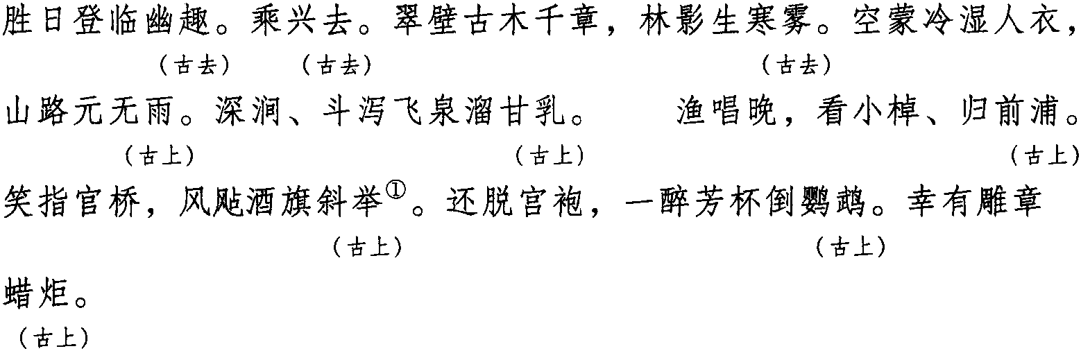注:一、本词例押古上声“语” “麌” 韵,古去声 “御” “遇” 韵。因“语”“麌” “御” “遇” 在现代韵中属“居”韵,故全调可押衣部“居”韵。