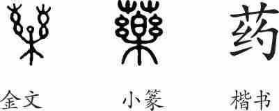 “药”是形声字。金文从艸(艹),樂(乐)声。小篆整齐化。隶变后楷书写作“藥”。后借“药”来表示,从艸,约声。如今规范化以“药”为正体。