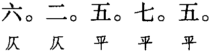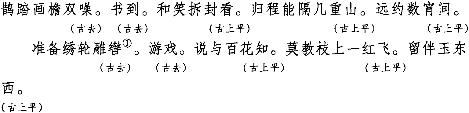 注:本词例押古去声“号” “寘”韵,古上平声“寒” “删” “支” “微” “齐”韵。因在现代韵中“号”属“高”韵,“寘”属“衣”韵,“寒” “删” 属“山”韵,“支” “齐”属“衣”韵,“微” 在古韵中同 “衣” 韵,故本调仄韵为高部“高”韵,衣部 “衣” 韵; 平韵为山部 “山” 韵,衣部“衣”韵。全调共押三个韵。