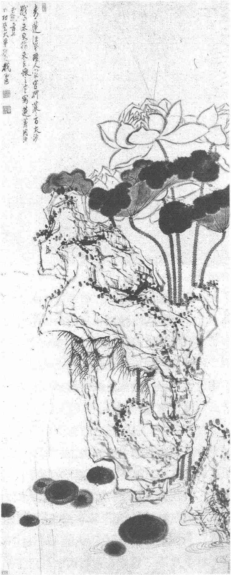 与一般莲石图不同的是:陈洪绶互换了莲花和湖石的轻重关系。历来画莲花和湖石,总是把莲花画得婀娜轻盈,亭亭玉立,而湖石则厚重稳健,压住画面;陈洪绶却反其道而行之,莲花画得笔重墨浓,分量感十足,而湖石则率意勾勒,显得轻巧有致。这样的处理,使得这幅作品一上来就新人眼目,惹人注意。