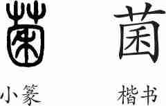 “菌”是形声兼会意字。小篆从艸(艹),囷声,囷兼表圆囤之意。隶变后楷书写作“菌”。