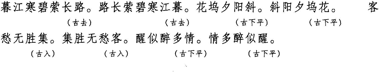 注: 本词例押古去声“遇” 韵,古入声 “陌” “缉” 韵,古下平声“麻” “庚”韵。因 “遇” 在现代韵中属 “衣” 韵,“陌” “缉” 在古韵中与 “碧”“立” 同韵,而“碧” “立” 在现代韵中属 “衣” 韵,故 “陌” “缉” 可押“衣” 韵; “麻” “庚” 在现代韵中属 “花” 韵,“醒” 与 “情” 属宽韵,可为平声。故全调仄韵可押衣部“衣” 韵,平韵可押花部“花” 韵、东部“声” 韵,全词三个韵字。