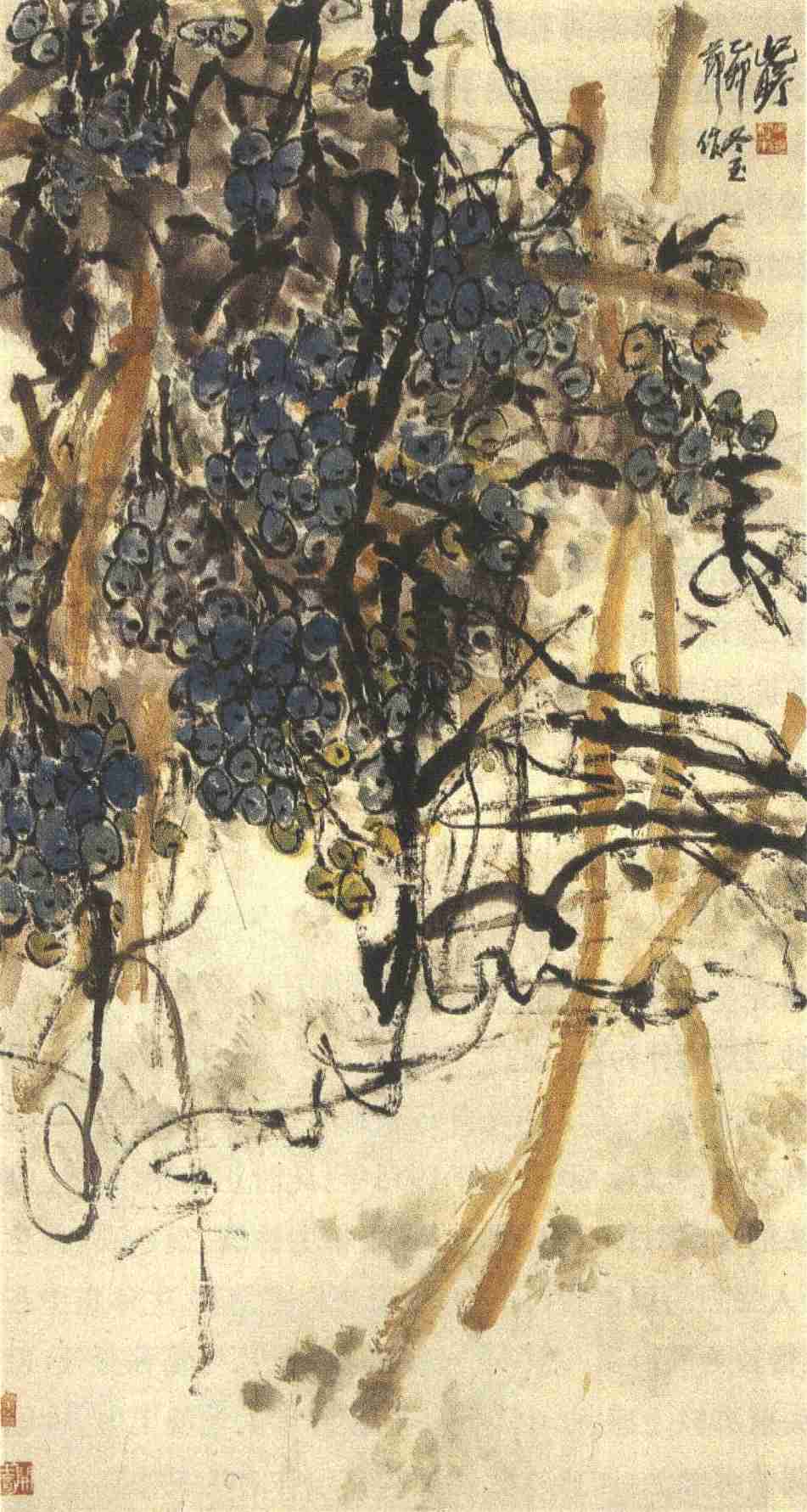 已往,屺瞻先生曾以没骨法,用汁绿色写晶莹滋润、鲜汁欲滴的网篮中的葡萄,犹如一曲明亮的轻音乐。而此图则采用了截然不同的表现手法,全图以蓝色调为主,墨叶作衬,色调沉静而单纯。作者设色打破了传统常规,大胆采用缺少透明感的矿物质颜料石青、石绿,以此来表现多汁的葡萄,这无疑是个难题,但正是作者追求浑厚画风的一种创意。画家对色彩有着深刻领悟:体要厚重、气要轻清。体不重则轻、气不清则俗,色可厚而不可腻,腻则无神韵。而“韵”是一种旋律,一种能动的气势,色愈强烈愈须画得能动有气势。作者趁葡萄色彩将干未干之际,以生动而有节奏的旋律用焦墨勾圈,加上疏密聚散、错落有致的结构变化,使颗颗葡萄从色阶相近的背景中突现出来,显得厚重而明快,强烈而和谐,活泼而有生机。屺老在施色时十分讲究笔法的变化,亦讲究色彩的变化,除了石青色外,不少嫩粒缀以石绿,在单纯的色平面中起了微调作用。几竿支架的浅赭墨色,恰与石青色构成潜存的对比关系,又为画面色彩增加了丰富感。支架下的浅色苔点看似漫不经心,实则对画面的组合连结、虚实变化有着不可低估的作用,这些点厾运笔稳健,排列大小都包含着画家的经营苦心。