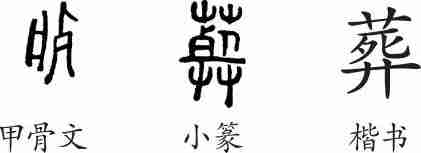 “葬”是会意字。甲骨文像人在棺内以草掩埋之状,会埋葬之意。小篆复杂化,像尸体横陈在“一”(垫子)上,四周以草蒙覆的样子。隶变后楷书写作“葬”。