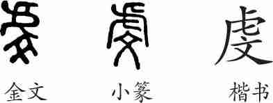 “虔”为会意字。金文从虍。小篆的形体与金文相似。隶变后楷书写作“虔”。