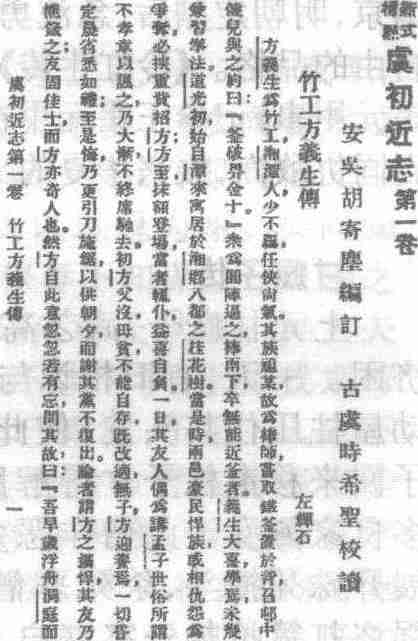 清代文言短篇传奇、轶事小说选集。十二卷一百二十一则。题“安吴胡寄尘编订,古虞时希圣校读”。辑者胡怀琛(1886—1938), 笔名季仁、寄尘,安徽泾县人。成书于民国元年(1912),民国二十一年(1932)增订重编。