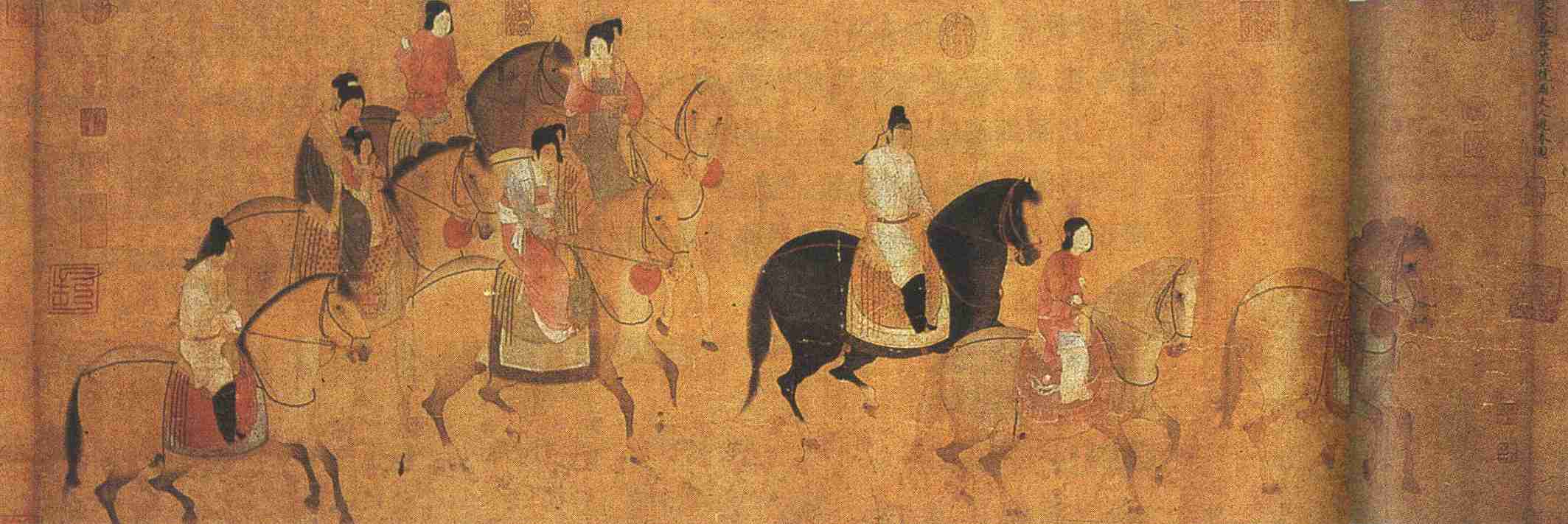 此图传为宋徽宗赵佶临本,无款记,绫隔水上有金章宗(完颜璟)所写标题,称之为“天水摹”。天水是赵姓的郡望,这里指赵佶,不过一般认为此卷并非赵佶所摹,可能出自画院某一高手。全画描写了八骑人马(九人)在春光中出游的情景。前面三骑与后面三骑是侍从、侍女和保姆,中间并行的两骑为秦国与虢国夫人(也有人认为是韩国与虢国夫人)。秦国夫人居右上首,面向虢国,述说着什么。虢国夫人仪态端庄,悠然自若。在画家笔下,她们不是骄横的形象,而是气质高贵的贵妇人,如杜甫《丽人行》所说的“态浓意远淑且真,肌理细腻骨肉匀”。