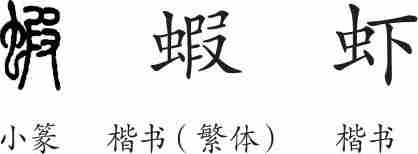 “虾”是形声字。小篆从虫,叚声。隶变后楷书写作“蝦”。汉字简化后写作“虾”。