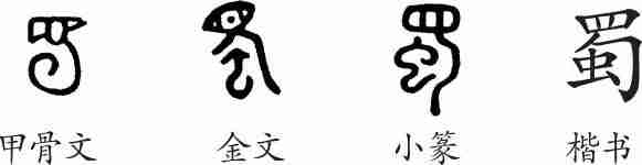 “蜀”是象形字。甲骨文像蚕蠢蠢蠕动的样子,头部(即“目”)显得非常突出,下面是卷曲的身体。金文已经不大像蚕的形象,便另加“虫”以示意。隶变后楷书写作“蜀”。