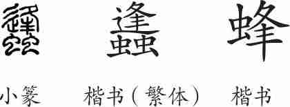 “蜂”是形声字。小篆从虫,逢声。隶变后楷书写作“蠭”,俗省作“蜂”。如今规范化,以“蜂”为正体。