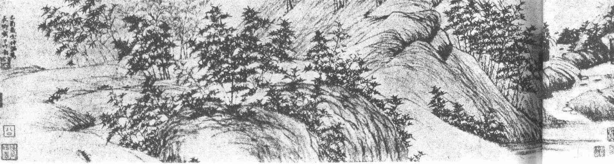 打开他的《为长卿写万竹图》卷,流水清澈,惠风和畅,寸冈尺堑,千篁万玉,摇曳生姿,翩翩欲舞。这一切均用平淡蕴藉的笔墨出之,不见丝毫霸悍奋昂之气。由此构造了一个恬静疏稀、朦胧淡远的美的境界,一股清新空灵的氛围,扑人眉宇。