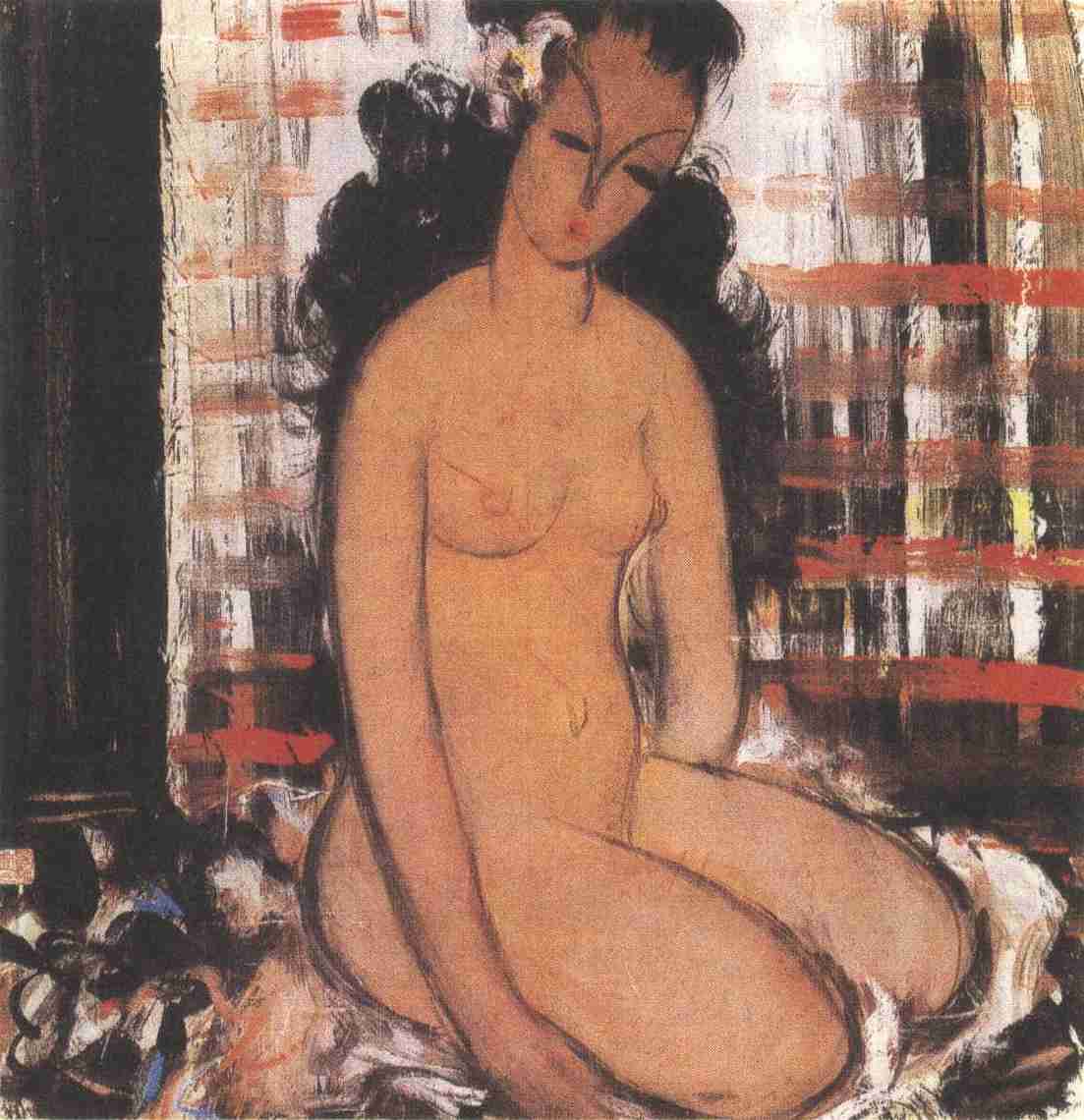 与林风眠其他一些融合中西的创作相比较,这件作品有着较为浓郁的西方油画的意味。从线条特征和造型法则来看,画面上的人体显然脱胎于西方野兽派大师马蒂斯,即抓住或夸张人体的主要结构和决定人体形态的转折之处,其余以流利松放的线条概括之,这种表现手法摆脱了对物象严谨的理性分析,以表现人物大的动势和特征为目的,给观者以舒适、安逸的感受。从作品中裸女被拉长的脸部和颈脖上,画成一条黑线的眼睛和东方意味的樱桃小口上明显地反映出林风眠受莫迪里阿尼的影响颇深。同时,这种外形又与画家心中经常挂念的身材修长的法国妻子有着某些相似之处。此外,同林风眠许多仕女图中轻盈、舒展的女性体态不同的是,这幅作品中人体的轮廓线条被反复叠加,从而增强了人体的重量感和体积感,这种表现手法和效果又与塞尚如出一辙。而以横向竖向的线条组合构成的背景又使画面更富于形式感。