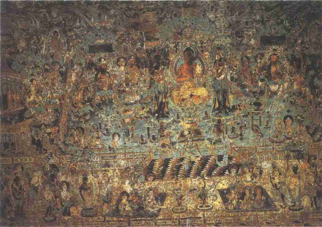 经变画大都宣扬净土,描绘幻想中的“极乐世界”。佛教宗派中的“净土宗”,渊源于东晋,定型于唐代。此宗专念“阿弥陀佛”名号,以期“往生”西方“净土”(“极乐世界”),宣扬《无量寿经》、《观无量寿经》、《阿弥陀经》等经。唐代“净土宗”广泛流行,是造成那时“净土变”壁画题材盛行的重要原因。经变画的画面格局多以七宝池为中心,平台楼阁置于周围,正中前后一般有三大殿,两侧有配殿或塔式建筑,并以栏楯、虹桥相架沟通。图中殿堂建筑佛陀居中,菩萨左右分列,宝池以石绿重色回环,显出皎洁的情致。伎乐舞伴演奏,表现出“无有众苦,充满诸乐”的诱人佛国净土场景。“彼佛土……金绳界道、城阙宫阁,轩窗罗门”,构成唐代经变画中“西方极乐世界”的定型式样。