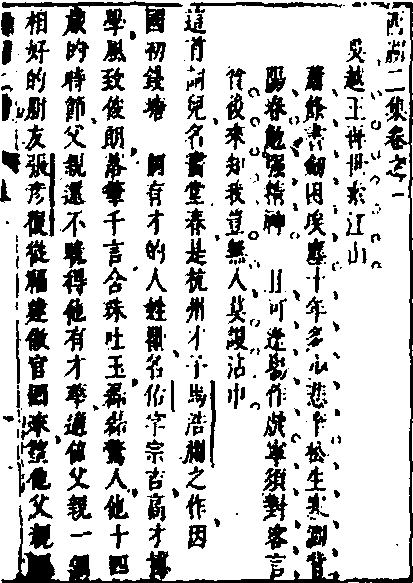 明代白话短篇(拟话本)世情小说集。又名《西湖文言》。三十四卷。题“武林济川子清原甫纂,武林抱膝老人訏谟甫评”。据序知编纂者为周楫,字清原,杭州人。成书于明崇祯年间。