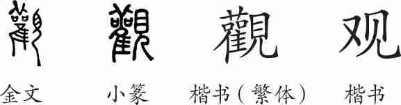 “观”是会意兼形声字。金文左边是个类似于猫头鹰之类的猛禽的形象,右边是“見”字,会观察之意。楷书写作“觀”。汉字简化后写作“观”。