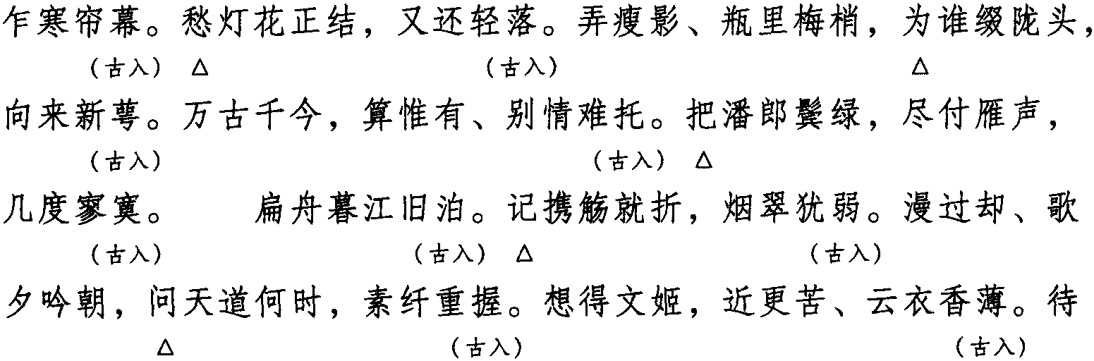 注: 本词例押古入声“觉” “药”韵。因“觉” “药”在古韵中与“握” “恶” 同韵,而“握” “恶” 在现代韵中属“歌” “波”韵,故全调可押歌部“歌”“波” 韵。