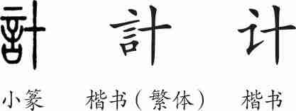 “计”是会意字。小篆从言,从十(表数目),会以言统计数字之意。隶变后楷书写作“計”,汉字简化后写作“计”。