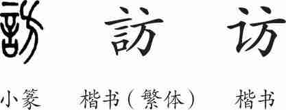 “访”是形声兼会意字。小篆从言,方声,方兼表四方、四旁之意。隶变后楷书写作“訪”。汉字简化后写作“访”。