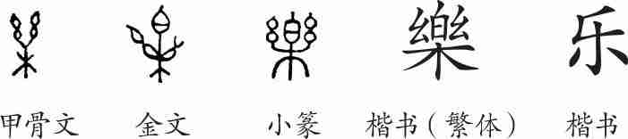 “乐”是象形字。甲骨文的字形表示在木的上面有两股丝质的琴弦,像古代的琴。金文字形在中间加“白”,像调弦之器。隶变后楷书写作“樂”。汉字简化后写作“乐”。