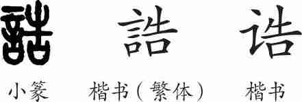 “诰”是会意兼形声字。金文从卄(双手),从言,会手持祭品向神祖祭告之意。小篆从言从告会意,告兼表声。隶变后楷书写作“誥”。汉字简化后写作“诰”。