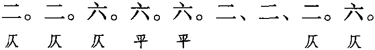 本格单片三十四字。全词平仄间叶。即前五句同韵,三仄声转两平声; 后两句同韵,仄声。仄韵韵字可上声、可去声,平韵韵字可阴平、可阳平。前两句为叠句。第六句为两叠句和一倒装句。本词乃 《调笑令》的一体,因同时出现在苏氏兄弟的词中,且调名不同、句式不一、声韵不同,故取之。
