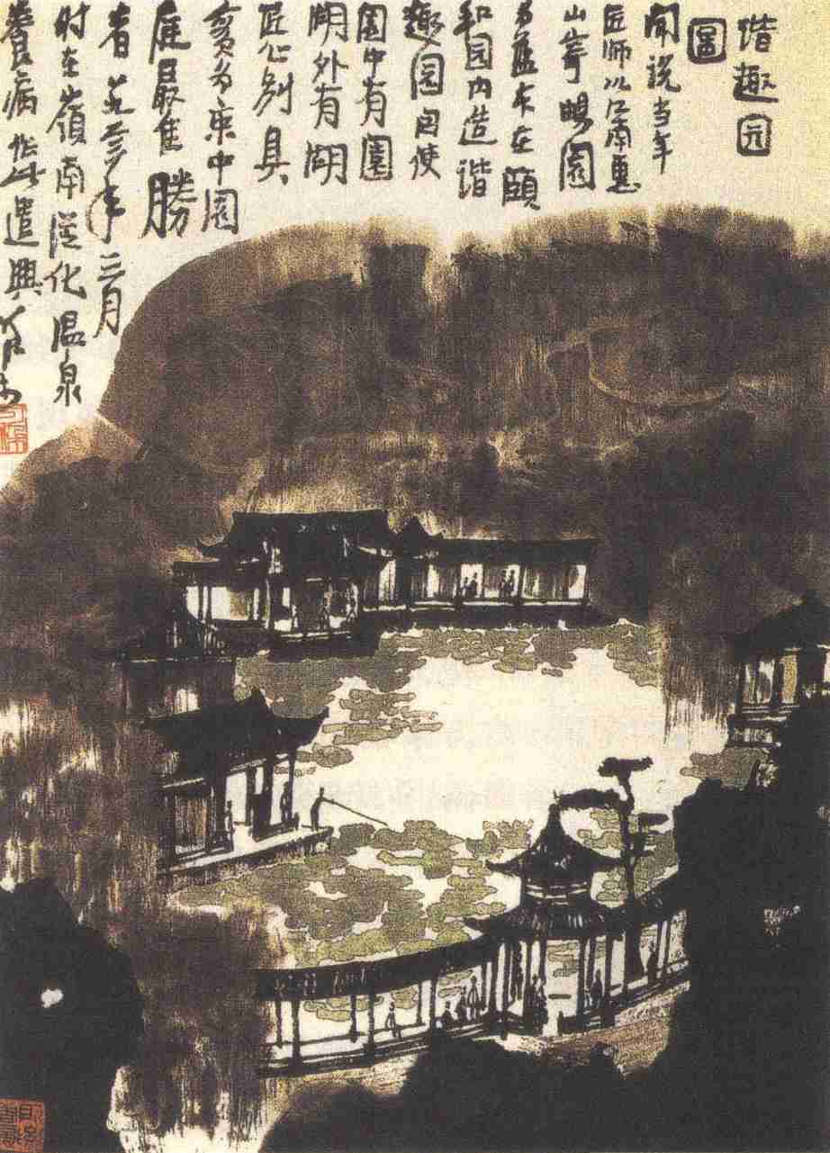 西画中的对景写生强调科学的准确的再现自然,而中国传统绘画中的“外师造化,中得心源”则更注重于情与景的交融,天人合一,表现画家对景物的感怀。由于李可染突破了传统山水的程式和技巧,并注重西画写生之法的实践,所以作品仍然呈现出西方风景画丰富的层次感和光感,加之对游廊里游人的描绘,使观者更能体会到场景的真实性。