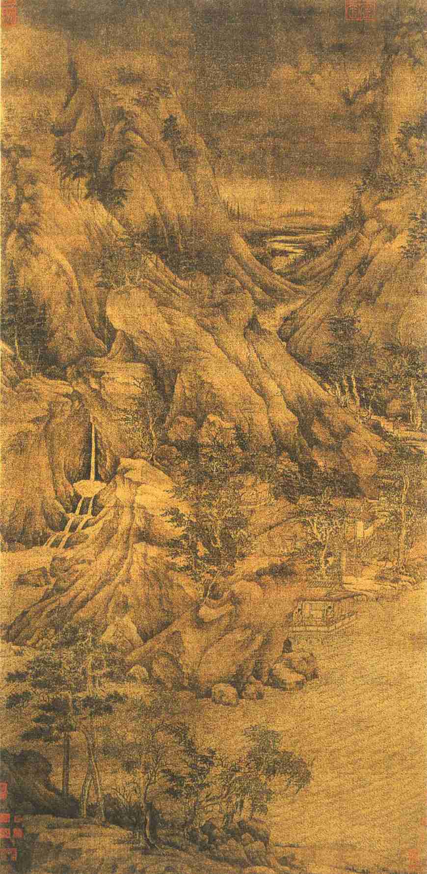 这一风格,与北方画派的描绘形式,是完全殊途的。主要在于山的轮廓凹凸部分的表现方法不同。北方的李派,必须以突出的主干线条来确定山的轮廓与凹凸的每一部分。而董源的画派,是不突出它的主干线条,却用无数的点、线来表现这些部分。这是《潇湘》等三图的形体。而《谿岸图》又与上述三图的体制不同,所写的是崇山峻岭,与北方画派的形体总的说来比较相同,但并不突出以表现山的凹凸的主干线条,而是以水墨烘晕来突出了它。因此,仍与北方画派的体格不同。高山大岭,用笔少而多晕染,骨体显得温润,绝无外强之气,也没有多少苔点。水势,还是唐代的传统体制,而描绘树木的精工生动,所配合的劲挺的笔势,显示了它的艺术特性。水阁里的人物,与卫贤《高士图》的骨体较接近。