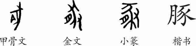 “豚”是会意字。甲骨文像一头猪,腹部还有肉(月)。金文中多了一只手,会用手捉猪之意。小篆基本上与金文相同。隶变后楷书写作“豚”。