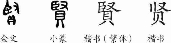 “贤”是形声字。金文从貝,臤声,表示财物多。小篆的形体与金文相似。隶变后楷书写作“賢”。汉字简化后写作“贤”。