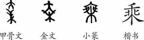 “乘”是会意字。甲骨文字形像一个人站在一棵树上,会登上之意。金文形体大致相同。小篆中的“人”形已经不太像了。隶变后楷书写作“乘”。