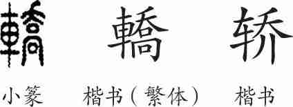 “轿”形声兼会意字。小篆从車,喬声。隶变后楷书写作“轎”。汉字简化后写作“轿”。