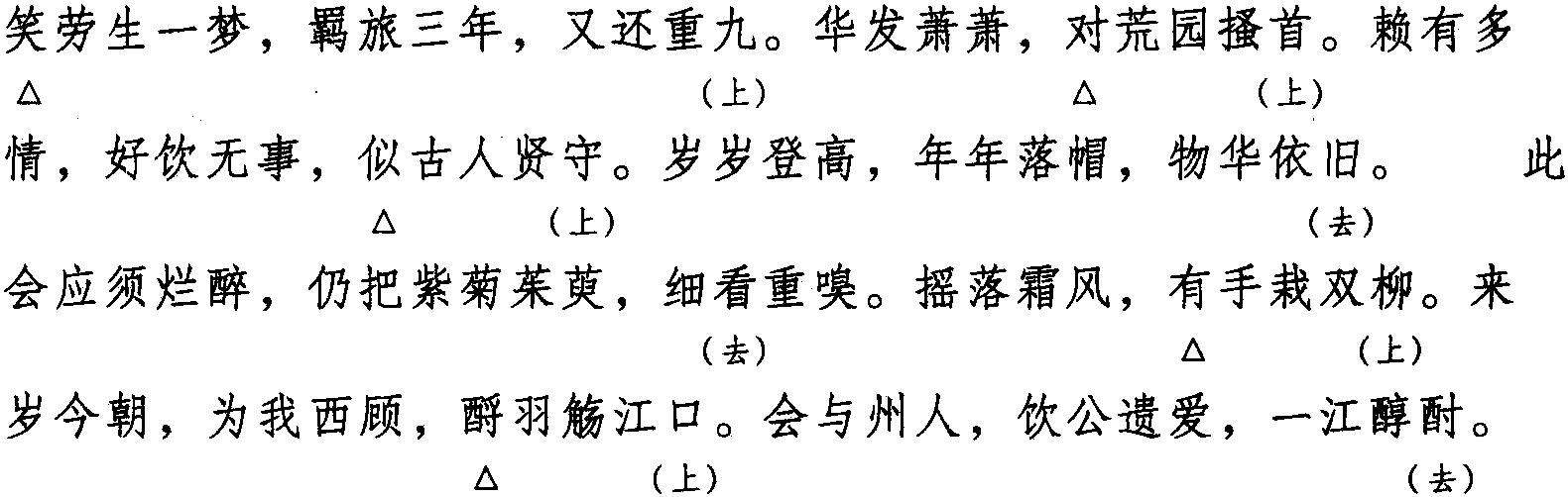 本格双片九十七字。全词同韵,仄韵,韵字可上声,可去声。凡五字句首字可作领字。下片前四句可制为 “四四四四” 句式,见葛胜仲词。另有九十八字体,见欧阳修词。