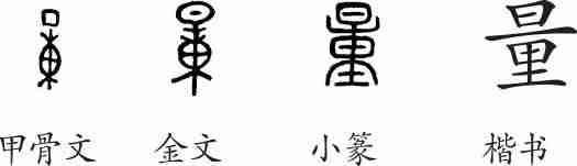 “量”是会意字。甲骨文下部像量器之形,上有口,表示可以向里面装东西。金文口中加一点。小篆整齐化。隶变后楷书写作“量”。