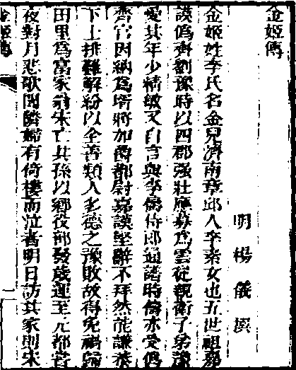 明代文言短篇传奇小说。又名《金姬小传》、《李姬传》。一卷。题“明杨仪撰”。杨仪,字梦羽,别号玉川,江苏常熟人。成书于明嘉靖二十四年(1545)。