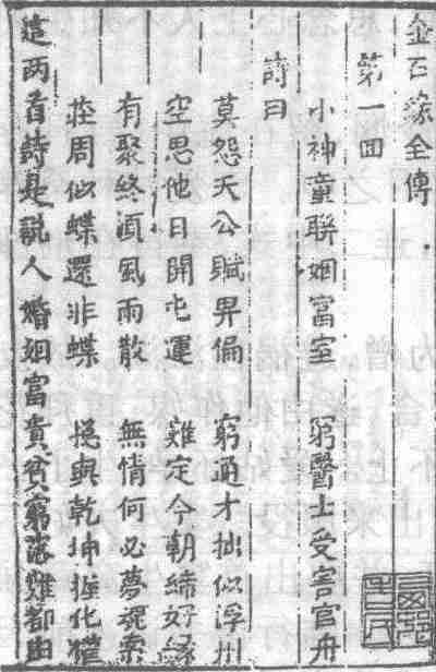清代白话长篇世情小说。全称《金石缘全传》。八卷二十四回。不题撰人。成书于清嘉庆五年(1800)前。