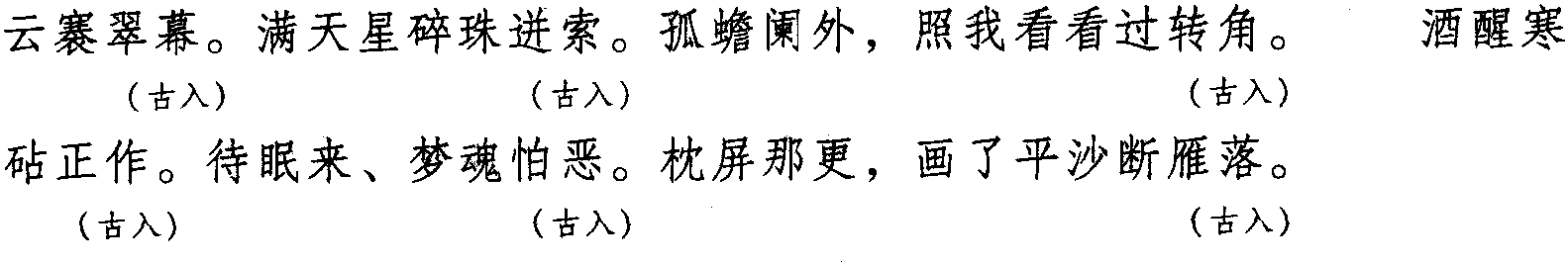 注:本词例押古入声“觉” “药”韵。因 “觉” “药”在古韵中与“作” “握”同韵,而“作” “握”在现代韵中属“波”韵,故全调可押歌部“波”韵。