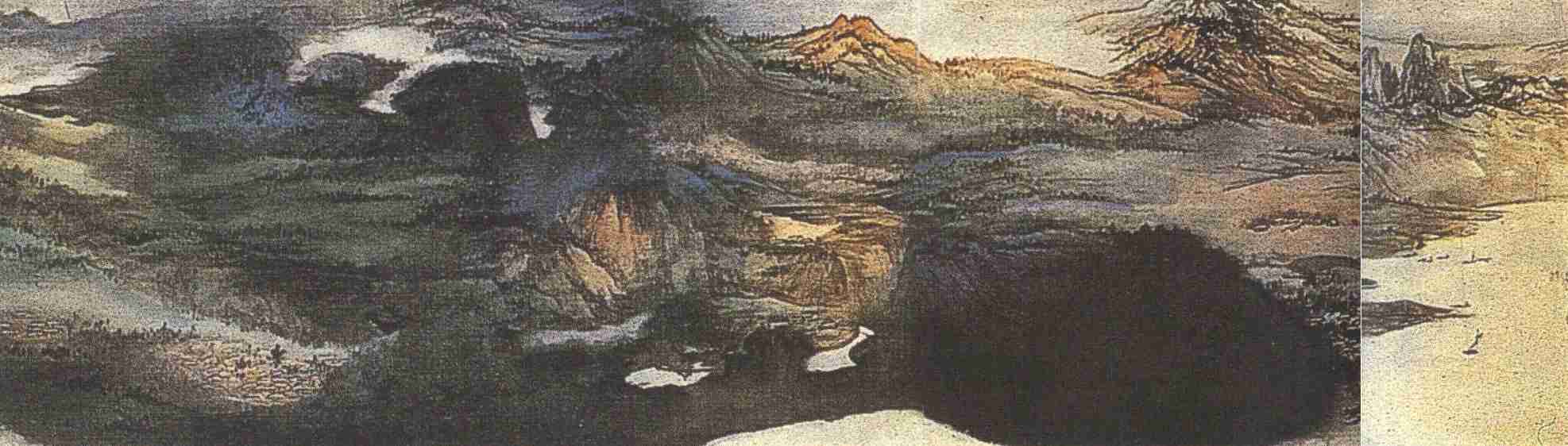 浩瀚的长江,是亚洲第一大河,横亘于中华大地,绵延万里,流入东海,古代不少大画家都以自己的画笔讴歌过它。如夏圭就画过《长江万里图》长卷,堪称千古名笔。夏氏原作已经失落,但从明代起就不断有各种摹本,可见这是多么激动画家心灵的题材。张大千1949年离开祖国大陆后,足迹遍及欧美、日本,又在中国香港、台湾寓居过,但他的心却时刻萦念着祖国大陆,去国三十年,总是眷恋着祖国壮美的河山。因而在他的笔下,不断展现出峨眉、黄山、华山……《长江万里图》长卷正是在这样的环境与心情下创作出来的一件杰作。该画是张氏七十岁移居巴西时所作。