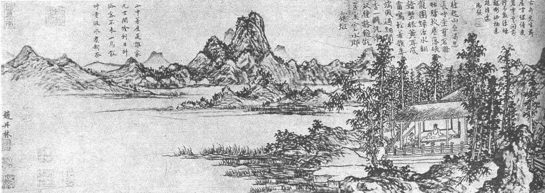 但尽管如此,《陆羽烹茶图》仍不失为一件代表了元代画风转变的优秀作品。它的主题内容表现了元代文人的消遁思想;它的基本画法出自董源画派,正是元代文人画家心慕手追的模范。从来论列文人画、尤其是元代文人画的思潮,都认为行家利家,泾渭分明,两不相涉。现在看来,这种观点值得商榷。当画工画鼎盛的六朝、隋唐时代,士大夫绘画原是附丽手画工画而发达起来的;而到了元代文人画勃兴的情势下,画工画又受到文人画的启导而发展变化,赵原就是一个例子。