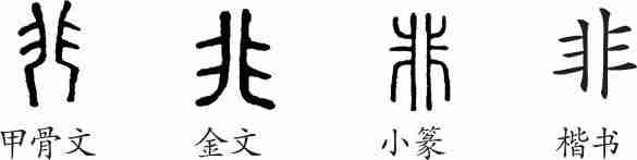 “非”是象形字。甲骨文像截取了飞鸟一对分张的翅膀,会分张相背之意。金文大体相同。小篆整齐化。隶变后楷书写作“非”。