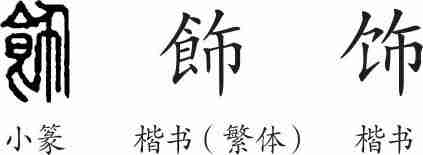 “饰”是会意兼形声字。小篆从人持巾,会擦拭之意,食声。隶变后楷书写作“飾”。汉字简化后写作“饰”。