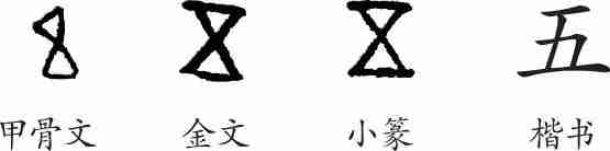 “五”是象形字。甲骨文、金文的形体像两物交叉之形。小篆的写法大致相同。隶变后楷书写作“五”。