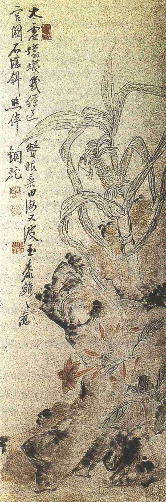 《黍离图》画中玉黍一颗,长于石旁,下出一花,以作陪衬。用笔冲和,抒写自然,既写实,又写意。此为黄宾虹花卉画中较为工整的作品。此画作于1944年,当时黄宾虹居北平(今北京),有感于世事如麻,民族殆危,作此以志慨。画上题有一诗:“太虚蠓蠛几经过,瞥眼桑田海又波。玉黍离离旧宫阙,不堪斜照伴铜驼。”寄有无限的爱国爱民族的情思。