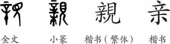 “亲”是形声字。金文从見,辛声,表示常見。小篆改为从見,亲声。隶变后楷书写作“親”。汉字简化后写作“亲”。