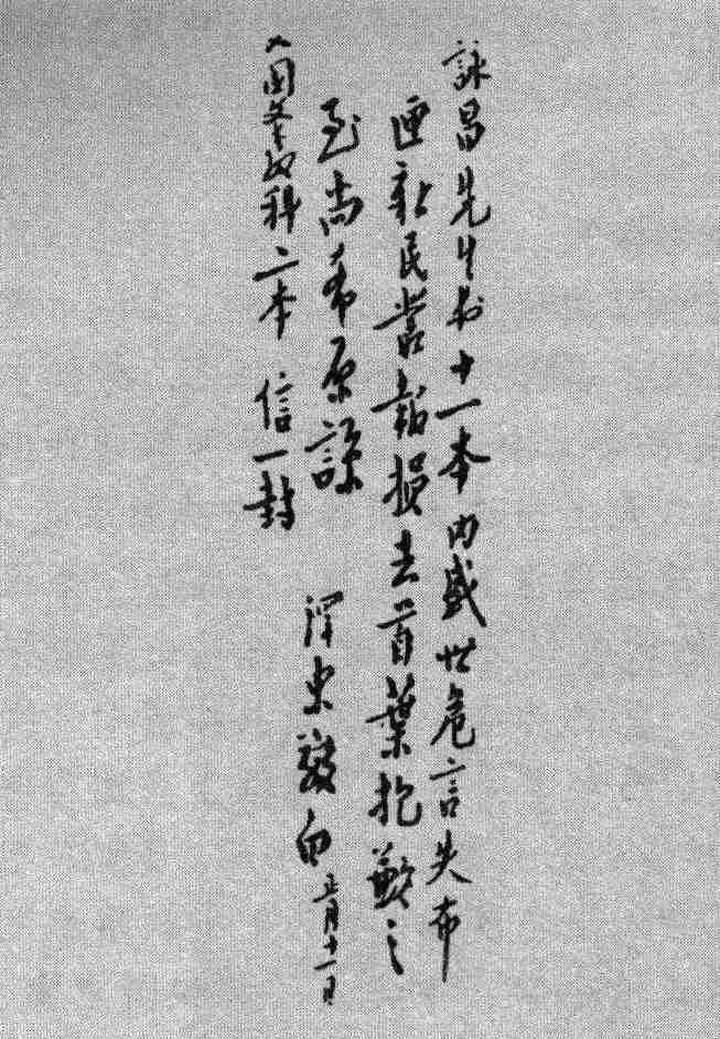 毛泽东的母亲逝世过早,他把对母亲的挚爱转移到岳母杨老太太身上。在上一辈的亲人中,杨老太太是最得毛泽东关心和牵挂的一个。1949年8月5日,长沙解放了。毛泽东得知杨老太太尚健在,非常高兴,立即发电报向她“敬致祝贺”,表示亲切的问候。他还特别嘱咐老太太的儿子、杨开慧的哥哥杨开智: “我身体甚好,告老夫人勿念。”毛泽东深深懂得,对于老人来说,远方儿女道一声“平安”,便是最大的安慰。9月,当他获悉王稼祥的夫人朱仲丽要回湖南省亲时,便托朱仲丽带去这一封便信,给老太太捎去一件皮袄,以御寒,也替杨开慧尽了人子之心。