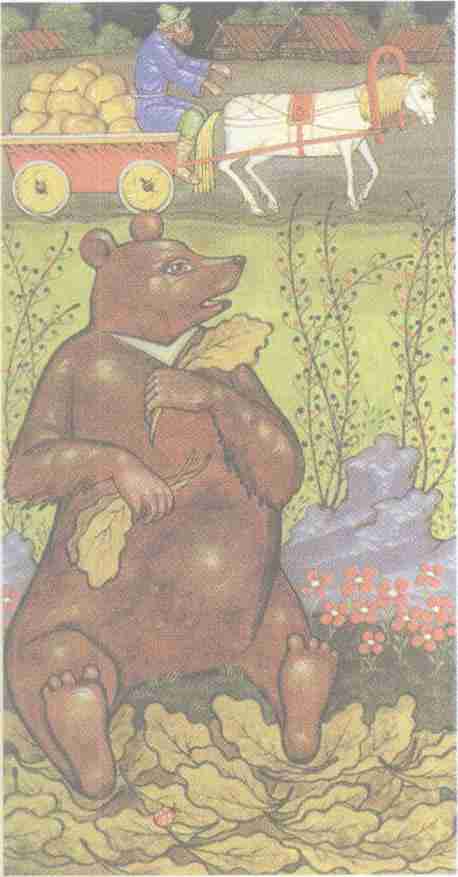 俄罗斯童话《农夫与熊》插图。农夫到山里去种地,小熊来缠着他。农夫和熊说好了,地上面的归熊,地下面的归农夫。结果农夫种了萝卜。秋天的时候,农夫拉了一车萝卜回家,而小熊只分到了萝卜缨子。
