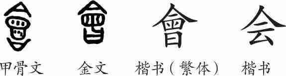 “会”是会意字。金文下边是仓体,上边是仓顶,中间是仓门,用储存谷物的粮仓来表示会聚之意。小篆承接金文而来。隶变后楷书写作“会”。