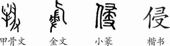 “侵”是会意字。甲骨文左边是一头牛,右边是一只持扫帚的手,会手持扫帚扫掉牛身上的灰尘之意。金文、小篆意义不变。隶变后楷书写作“侵”。