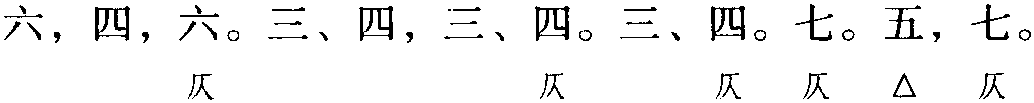 注:本词例押古上声“纸” “语” “麌” 韵,古去声“御” “遇” 韵。因 “纸”“语” “麌” “御” “遇” 在现代韵中属 “衣” “居” 韵。故全调可押衣部“衣” “居”韵。本词例亦可押姑部“姑”韵。因 “暑” “鼓” “楚” “处”“路” “炷” 属“姑” 韵,“去” “宇” “否” 在古韵中与“纸” “语” “麌”同韵,而“纸” “语” “麌” 在现代韵中同属“衣” 韵,而“麌” 在古韵中与“鼓” 同韵,“鼓” 在现代韵中属“姑” 韵,故全调亦可押“姑” 韵。